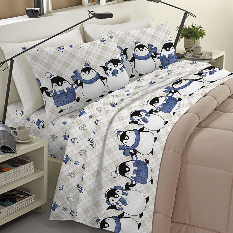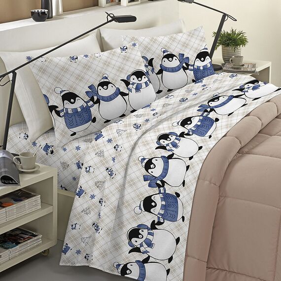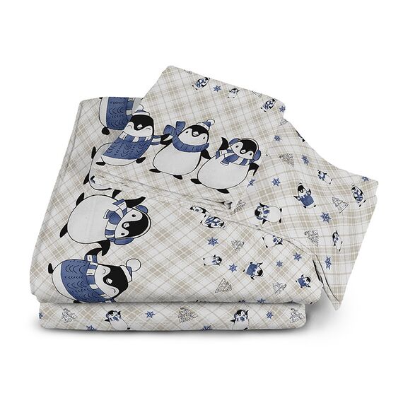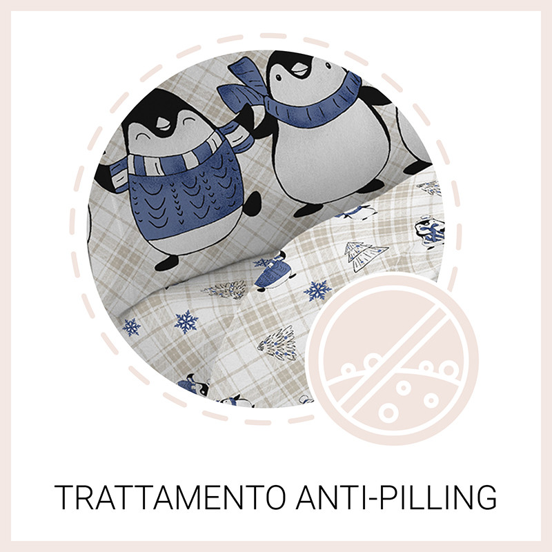 Completo Lenzuola in Flanella Anti-Pilling 100% Cotone - PINGUINI BLU