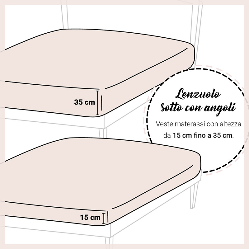 • Lenzuolo sotto con angoli adatto a vestire materassi da 15 cm fino a 35 cm